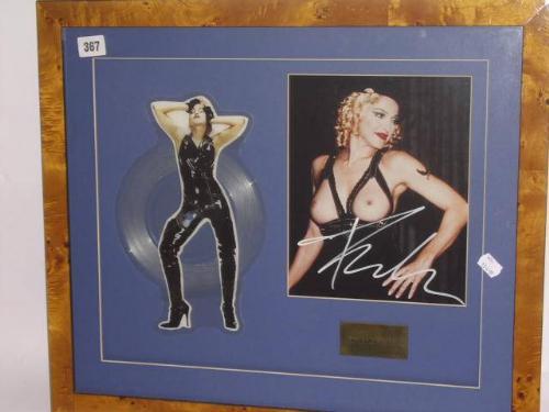 Autographed Madonna colour photograph (topless shot from "Sex") mounted with shaped Picture Disc Record and brass plaque housed in walnut effect frame 19x22" sold with provenance