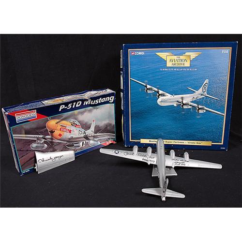 <Our item number 139813><B>Autographed Models.</B> An unusual lot that includes two models in their original boxes (some faults). One is a 2002 Corgi B-29 "Enola Gay" 1:144 scale model signed on the wings by <B>Paul Tibbetts</B>, pilot and by <B>Dutch van Kirk</B>, navigator. The other is a 1995 Monogram model of the P-51D Mustang, signed on the wing by <B>Chuck Yeager</B>, the first pilot who went on to break the sound barrier. A nice pair of models, each of which will require some assembly. <BR>Estimated Value $150 - 250. <BR><BR>Our item number 139813<BR><IMAGES><P ALIGN="CENTER"><IMG SRC="http://www.goldbergcoins.net/liveauction/49jpegs/139813.jpg"> </P></IMAGES>