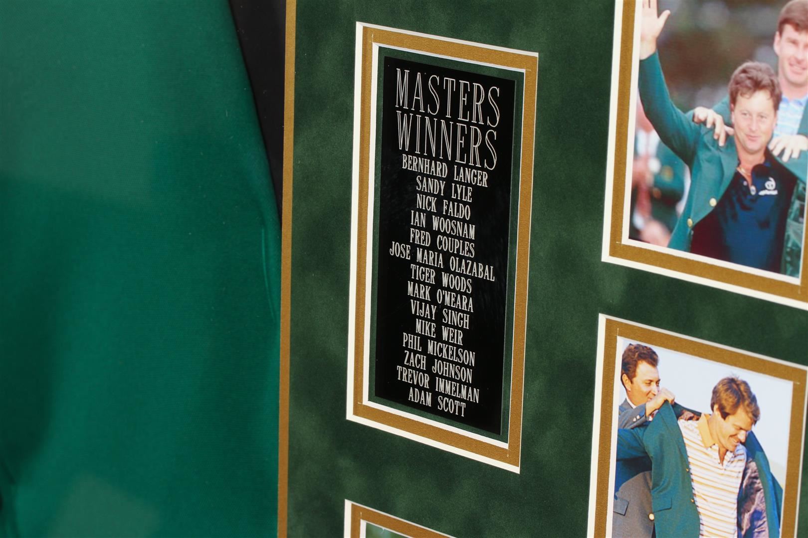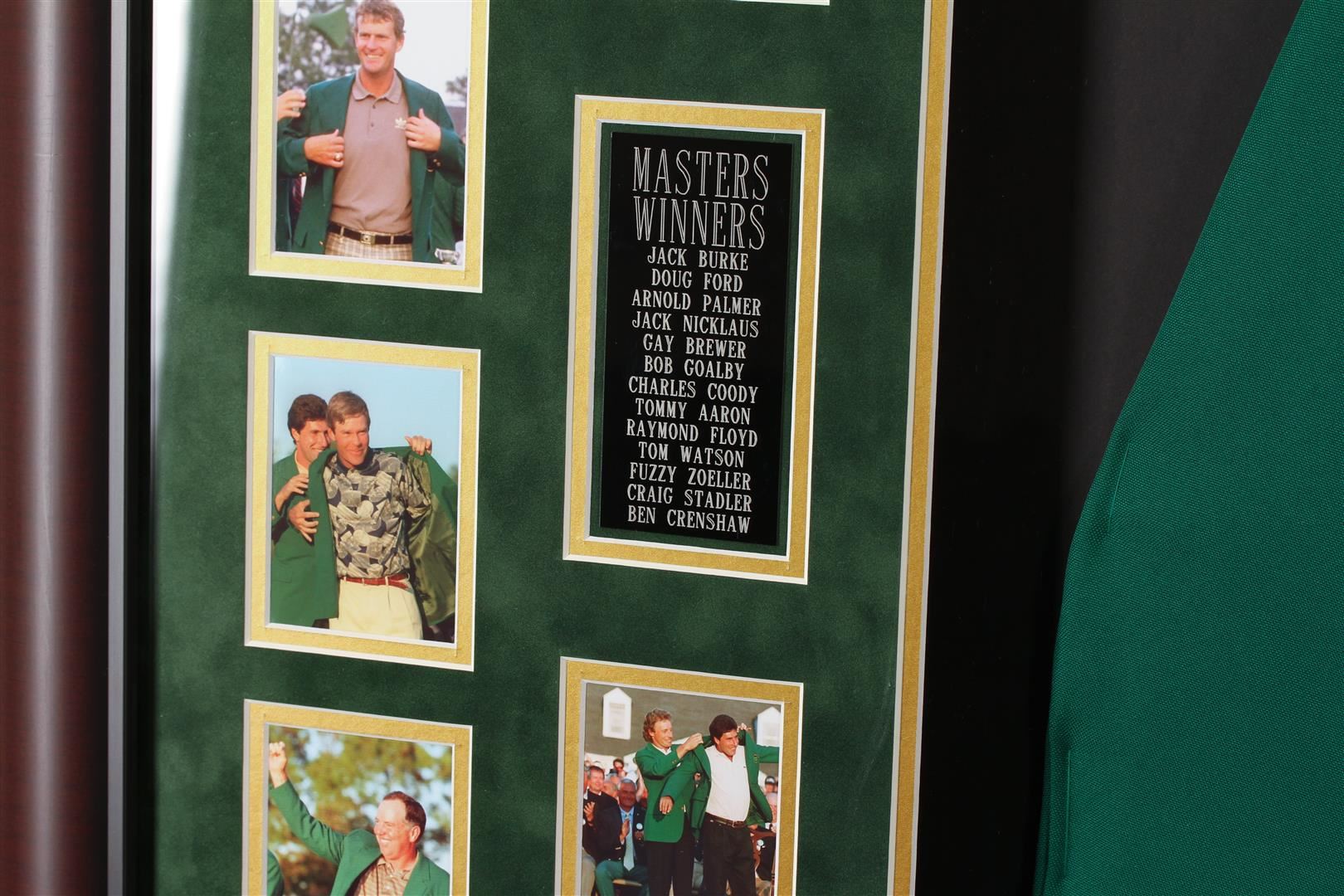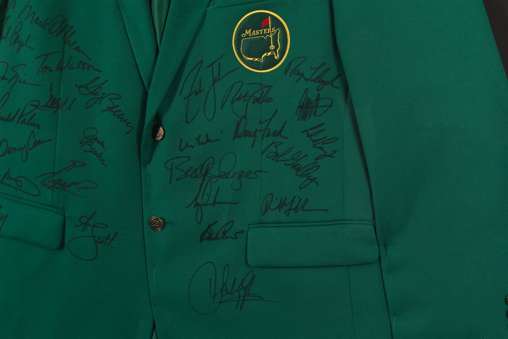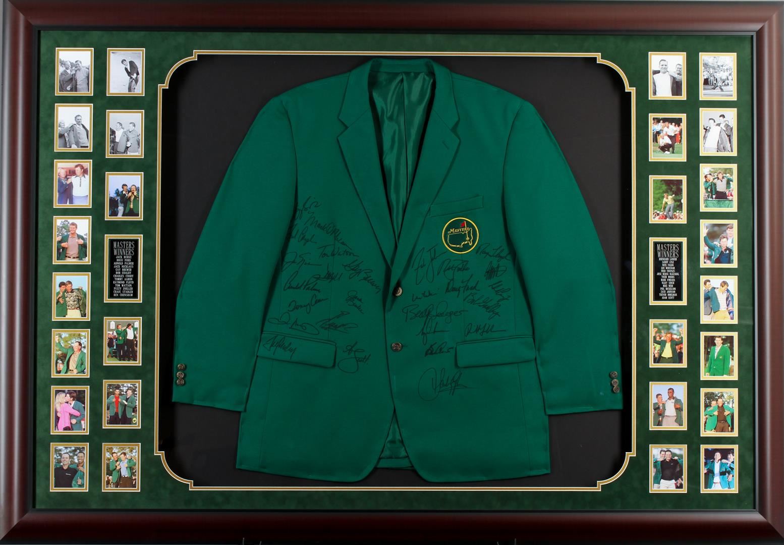 This collage features the classic Green Masters Jacket autographed by 29 former winners Jack Nicklaus, Arnold Palmer, Fred Couples, Phil Mickelson, Tiger Woods, Vijay Singh, Craig Stadler, Doug Ford, Tom Watson, Sandy Lyle, Berhard Langer, Trevor Immelman, Fuzzy Zoeller, Nick Faldo, Gary Player, Ben Crenshaw, Jose Maria Olazabal, Billy Casper, Tommy Aaron, Zach Johnson, Jack Burke, Charles Coody, Mike Weir, Mark O'Meara, Bob Goalby, Larry Mize, Ian Woosnam, Ray Floyd and Angel Cabrera. Measures 65" x 46".