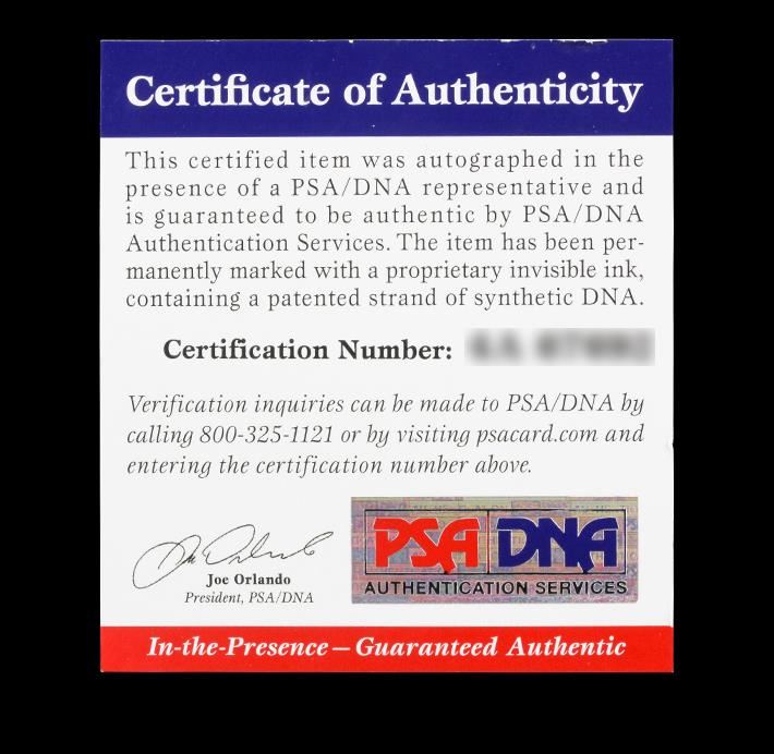 All autographed memorabilia comes with a Certificate of Authenticity. SAA may have an interest in certain third-party authenticators and bidder hereby waives any potential conflicts therein related to SAA’s relationship with such authenticators. SAA is not responsible for the opinions of any of the third-party authenticators. You should in no way rely exclusively on such third-party opinions without conducting your own due diligence prior to bidding. All Certificates of Authenticity may only be relied upon for one year from the date of sale of any item.