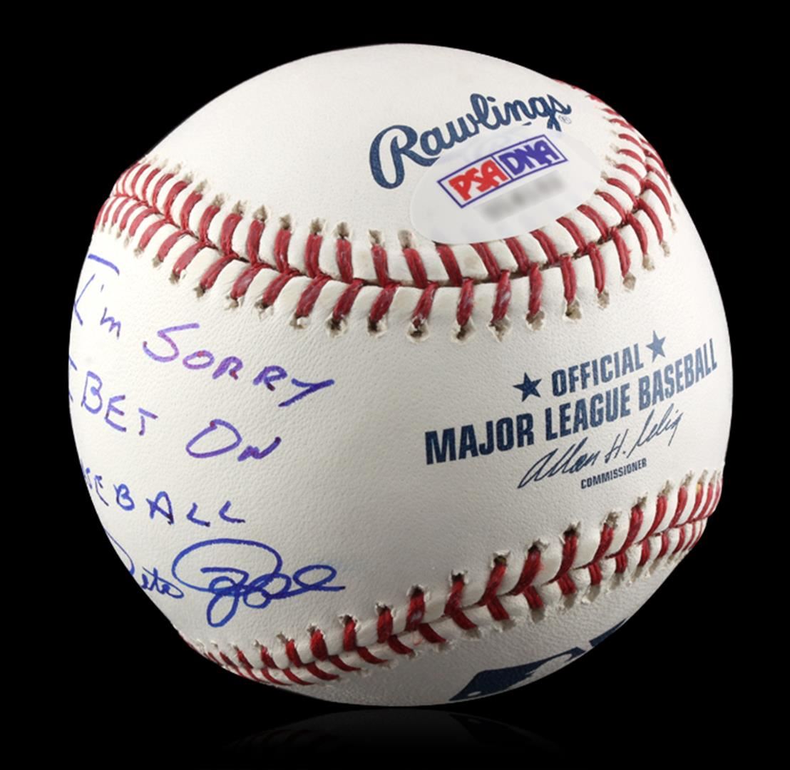 Autographed Pete Rose "I'm Sorry" Baseball PSA Certified. Excellent Condition! DX153MA. Signed Pete Rose baseball with I'm Sorry I bet on Baseball written on the ball. Pete Rose had 4256 hits in his 24 year career with the Reds, Phillies, and the Expos. Pete won 3 World Series Titles. He won in 1975 and 1976 with the Cincinnati Reds and he won his third in 1980 with the Philadelphia Phillies. PSA Certified.