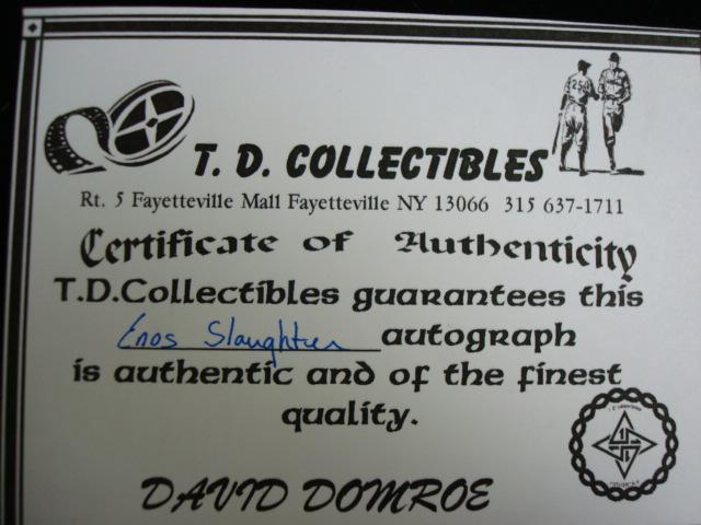 Autographed Photo ENOS SLAUGHTER with CA: 8 X 10 Color Photo Autographed by Enos Slaughter in New York Yankee Uniform with Certificate of Authenticity from TD Collectibles Fayetteville NY. (20-50)