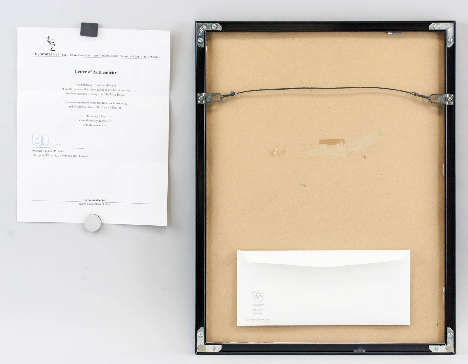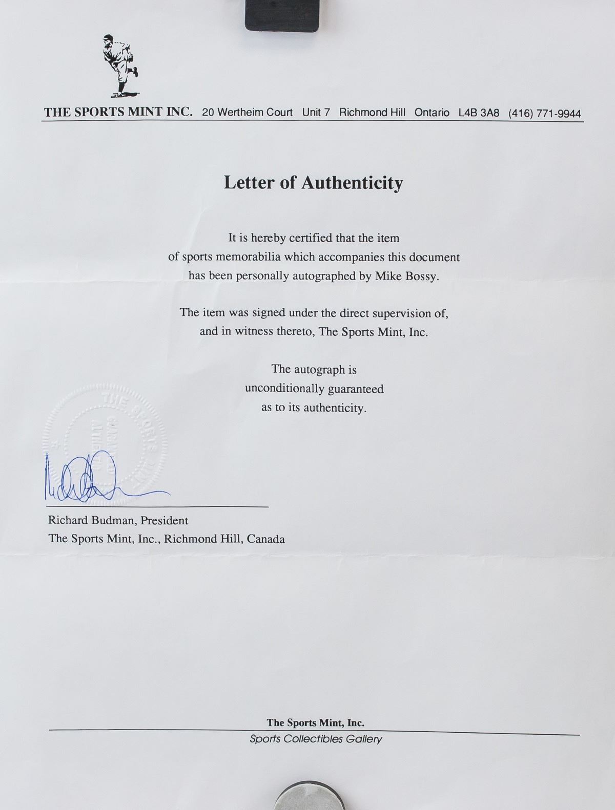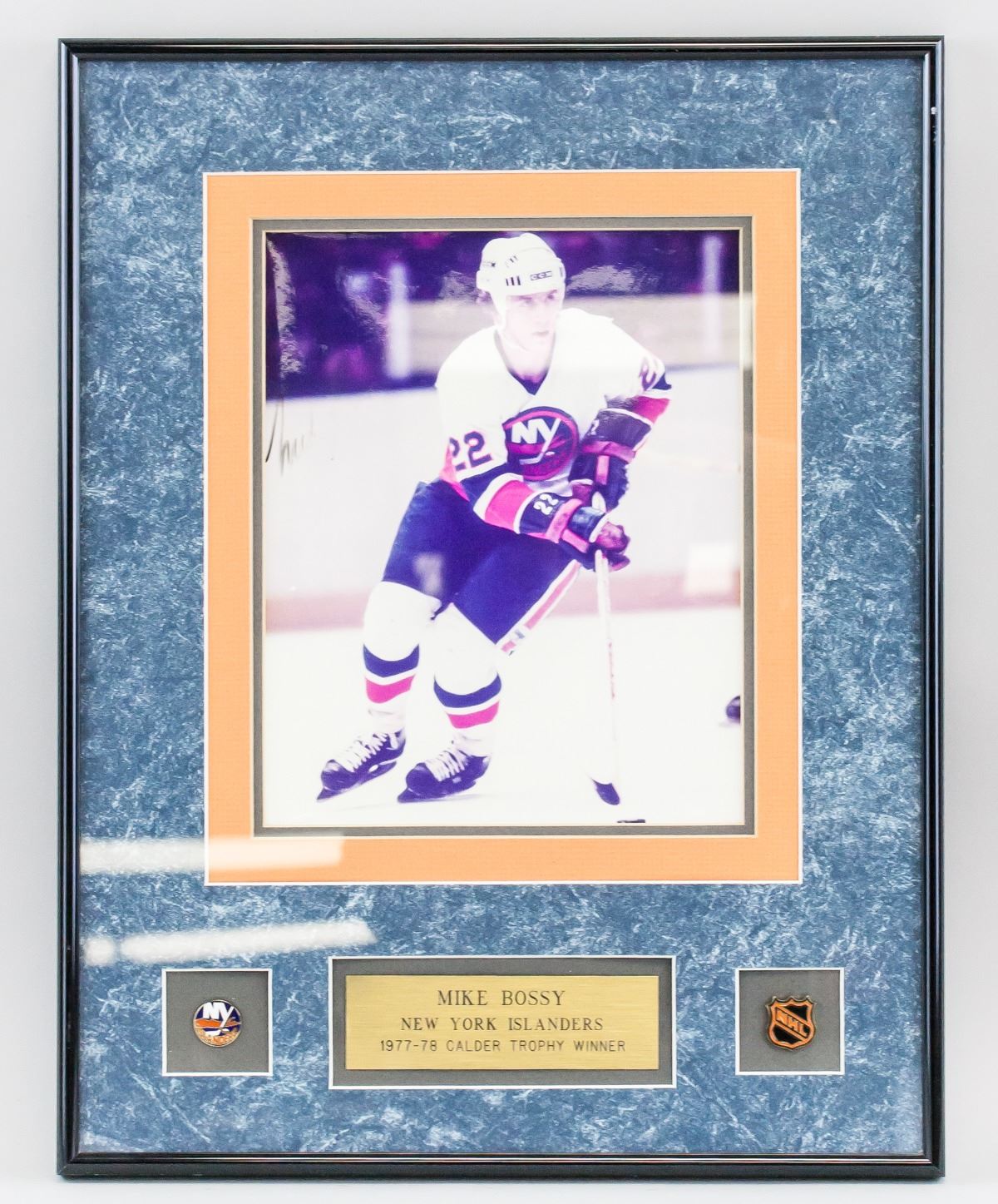 Autographed photo, framed. Signed Mike Bossy, NHL New York Islanders 1977-78 Calder Trophy Winner. Accompanied with letter of authenticity. 47 x 36 cm (18.5 x 14.5 in)