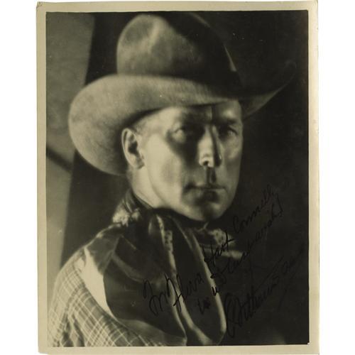 <B>Autographed Photo of William S. Hart.</B></I> This superb 8" x 10" portrait of the Screen's first great cowboy star is inscribed in fountain pen, "For Flora Hart Connelly with Best Wishes William S. Hart." Presumably Hart had a little trouble with the pen and began the word "with" twice, but this doesn't detract from the overall dramatic power and impressiveness of this excellent study of the legendary stage and screen attraction. Very Fine condition.<BR><BR><b>Shipping:</b> Flat Material, Small (<a target="_blank" href="http://www.heritageauctions.com/common/shipping.php">view shipping information</a>)