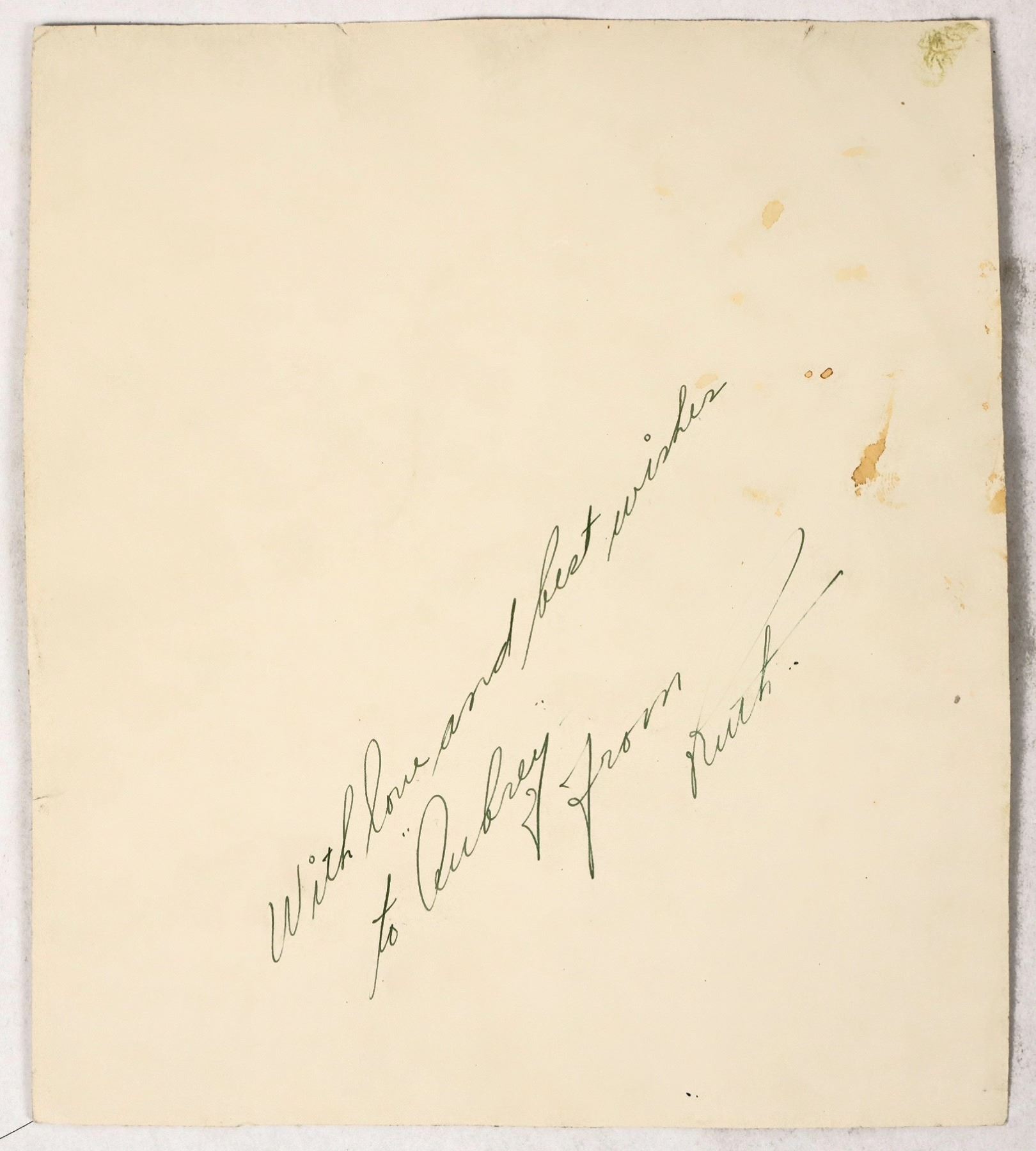This photograph is addressed "with love and best wishes to Audrey/ from/ Ruth". Possibly of Ruth Etting who had a colorful career in Zigfield and Hollywood. Her life was marred by a dangerous ex-husband who attempted to murder her current husband. The story worthy of a screenwriter's film. 8 in. X 9 in. Please see photo for details.
