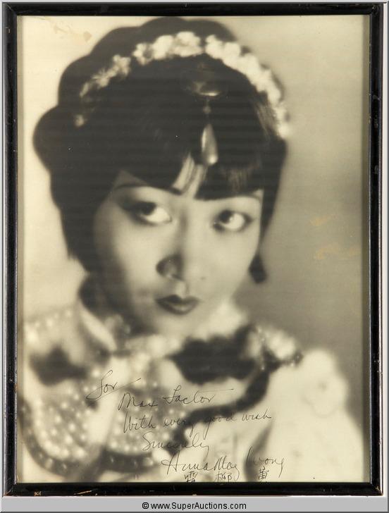Photograph of Anna May Wong with Original Autograph from the Max Factor Collection / "For Max Factor With Every Good Wish Sincerely Anna May Wong" / Anna May Wong was an Exotic Asian Actress of Silent and Found Films. Her most notable roles were "The Thief of Bagdad in 1924 and Shanghai Express in 1932 {11" L x 14" H in Frame}