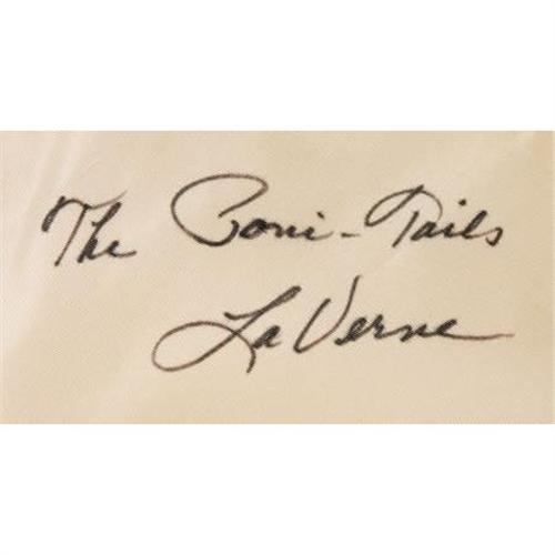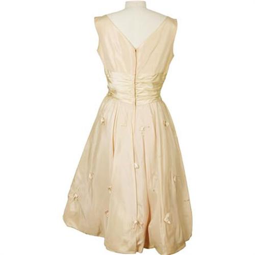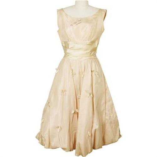 <B>Autographed Poni-Tails Dress Worn on "American Bandstand."</B></I> A pink taffeta dress worn by original Poni-Tails member LaVerne Novak during the group's appearance on <I>American Bandstand</B></I> in 1958. The dress is signed by Novak on the front in black permanent ink, and is dotted with tiny silk bows, with a pink satin sash adorning the fitted waistline. A crinoline and tulle-lined petticoat finishes its classic '50s construction. Although the dress has moderate signs of wear and discoloration along bottom hem and shoulder straps, it is in overall Very Good condition considering its age, and is accompanied by an LOA signed by LaVerne Novak. <I>Accompanied by LOA from PSA/DNA.</B></I><BR><BR><b>Shipping:</b> Clothing, Costumes & Jerseys (<a target="_blank" href="http://www.heritageauctions.com/common/shipping.php">view shipping information</a>)