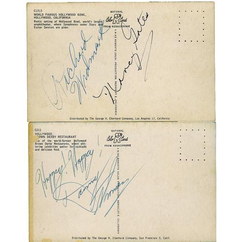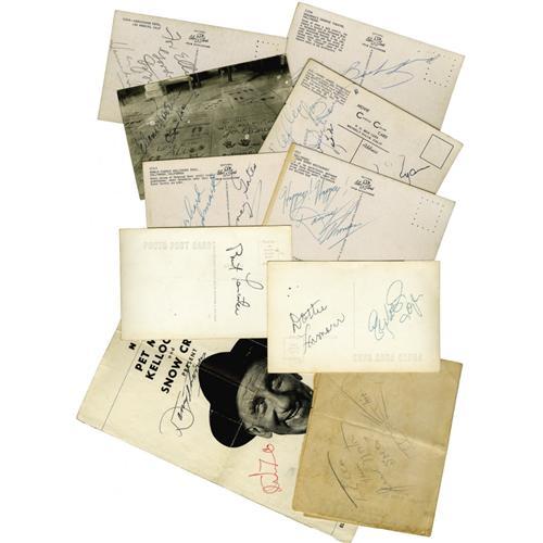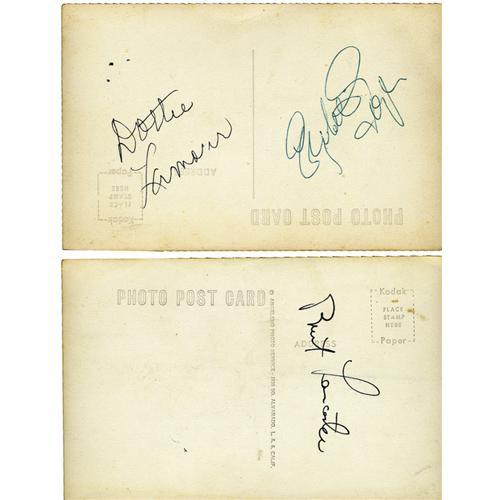 <B>Autographed Postcards Signed by Burt Lancaster, Ozzie Nelson, and Others.</B></I> Included are postcards signed by Ozzie Nelson and Harriet Hilliard; Burt Lancaster; Dorothy Lamour (as "Dottie"); Robert Ryan, Alan Ladd, and Ruth Roman; Danny Thomas; Eleanor Powell and Glenn Ford; Richard Widmark; and Charles Bickford; plus a handbill signed by Thomas and Jimmy Durante (in Fine condition with a moderate amount of creasing and some staining), and a typed CBS studio schedule inscribed in pencil on the back "To Ellie from Jack Norton/Sober?" above a doodle of a champagne bottle -- a nice touch from a teetotaler who often portrayed drunks in various movies (in Fine condition with fold creases, light wear to the edges and corners, and appreciable tanning). All are in Excellent condition unless otherwise noted. <I>With COA from PSA/DNA.</B></I>
