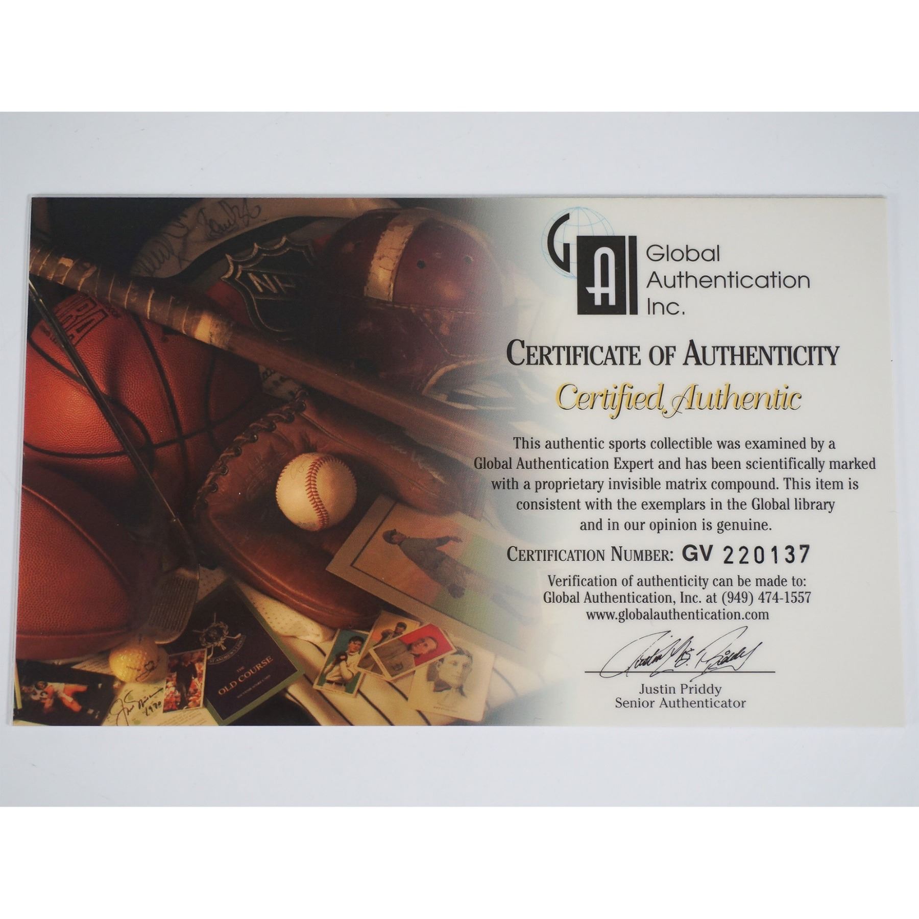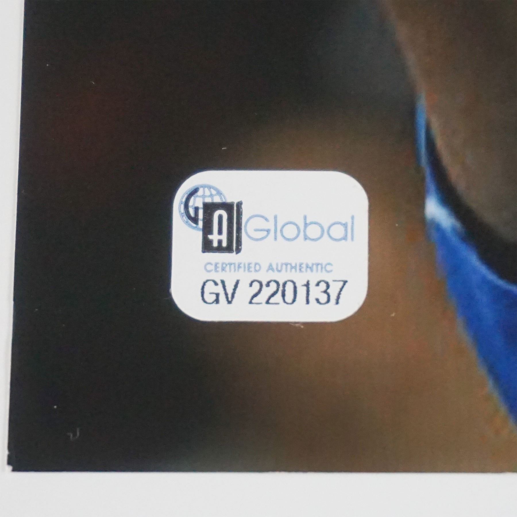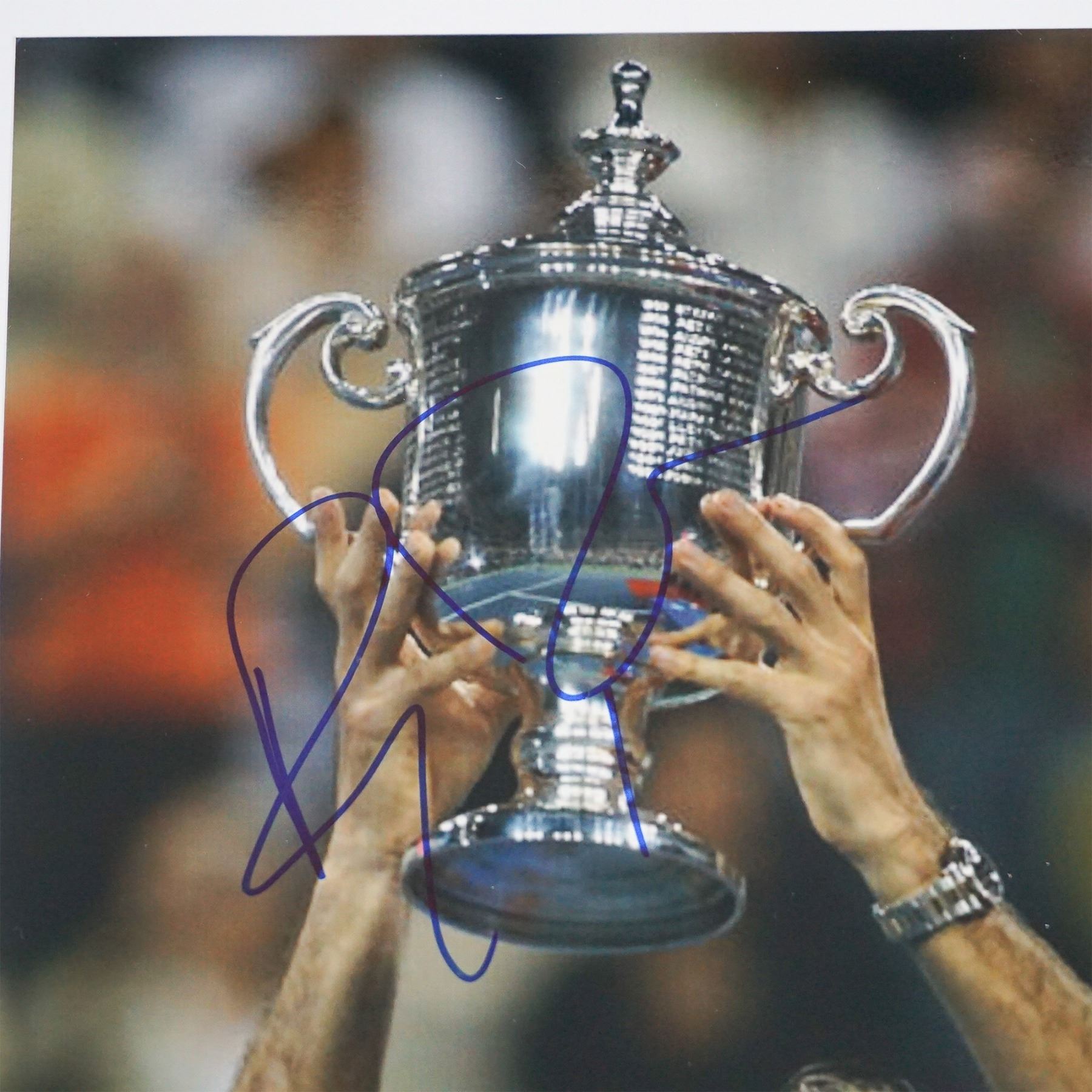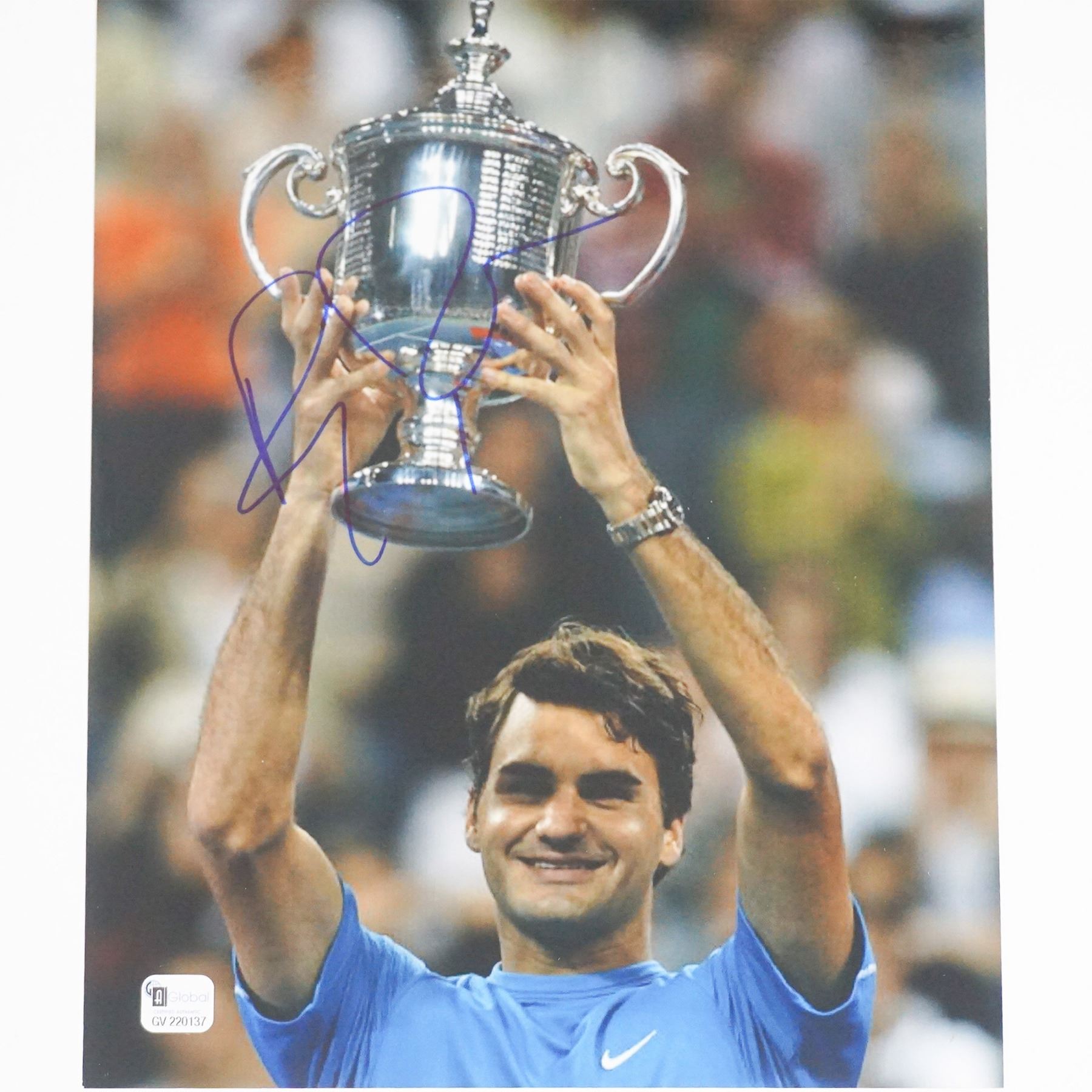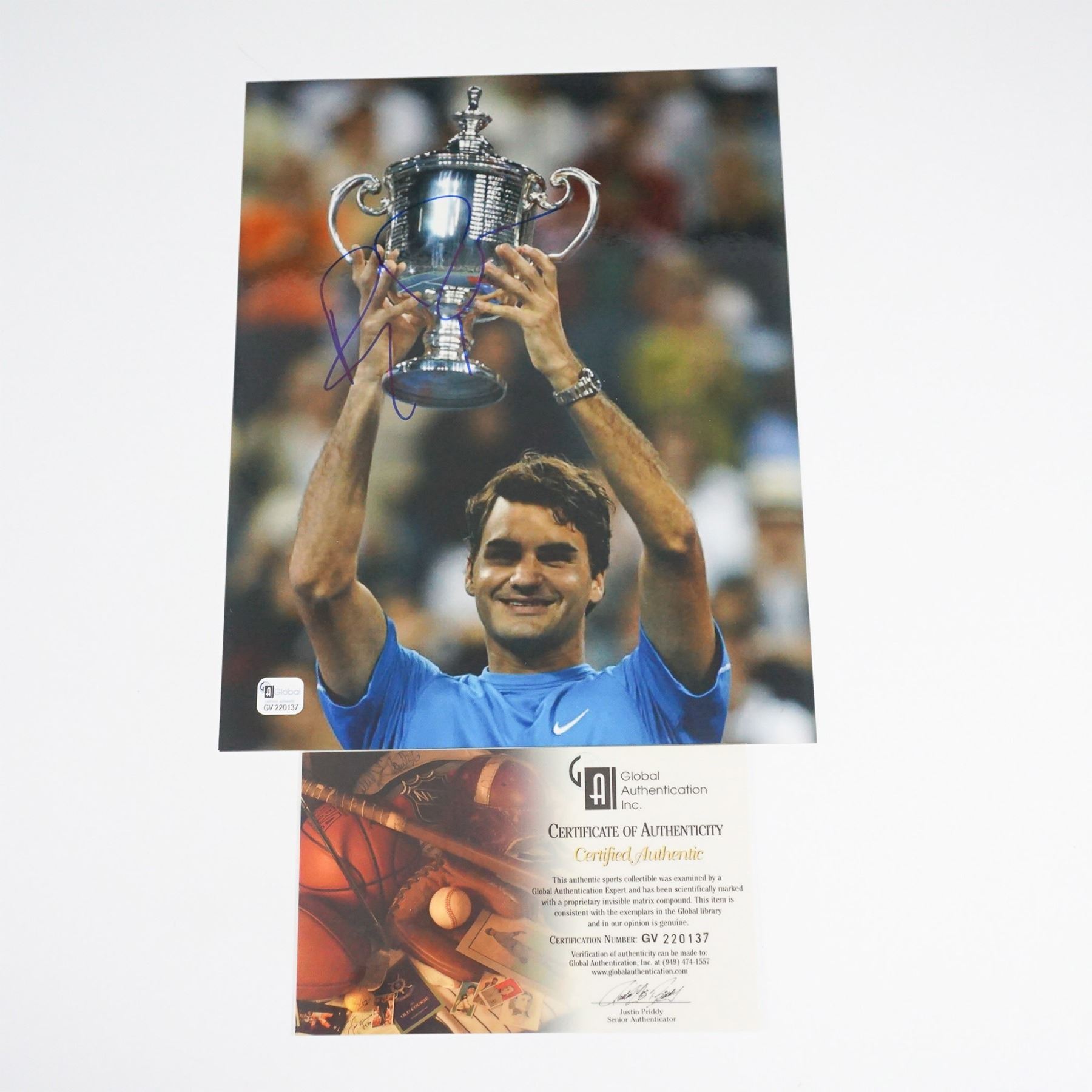 An 8"L x 11"H autographed photograph of tennis legend Roger Federer, depicting him triumphantly holding a championship trophy. The autograph is prominently displayed in blue ink over the image. Included with the photo is a Certificate of Authenticity from Global Authentication Inc. (GV 220137), verifying the signature as genuine. This collectible is a must-have for tennis enthusiasts and sports memorabilia collectors.