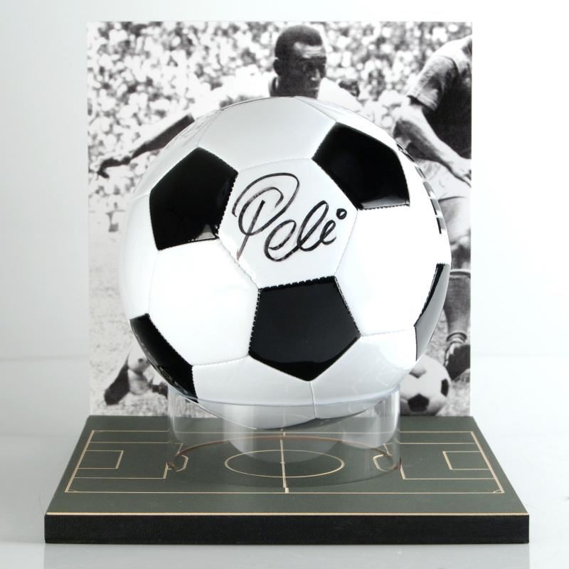 This is an autographed soccer ball by legendary Brazilian footballer, Pele! This piece comes in a display case with an image of the soccer legend. This piece is presented with a Letter of Authenticity from PSA/DNA, which authenticates sports memorabilia using proprietary permanent invisible ink as well as a strand of synthetic DNA. We make no additional warranties. Measures approx. 11" x 11" x 12" (display case).