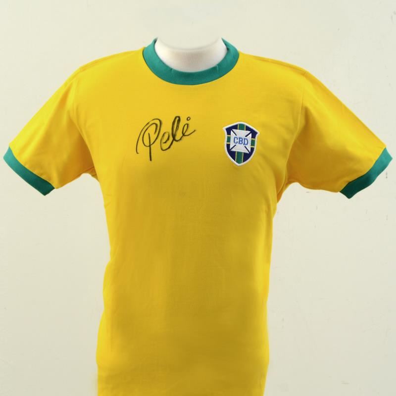 This is a replica Brazil soccer Jersey autographed by legendary Brazilian footballer, Pele! This piece is presented with a Letter of Authenticity from PSA/DNA, which authenticates sports memorabilia using proprietary permanent invisible ink as well as a strand of synthetic DNA. We make no additional warranties. Measures approx. 30" x 28" (jersey).
