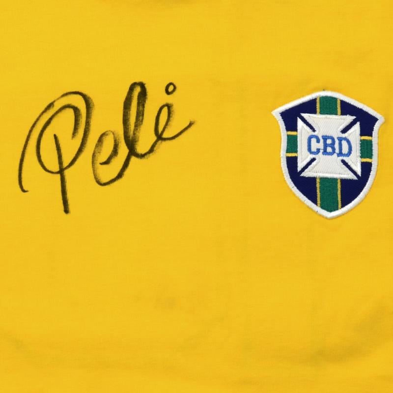 This is a replica Brazil soccer Jersey autographed by legendary Brazilian footballer, Pele! This piece is presented with a Letter of Authenticity from PSA/DNA, which authenticates sports memorabilia using proprietary permanent invisible ink as well as a strand of synthetic DNA. We make no additional warranties. Measures approx. 30" x 28" (jersey).