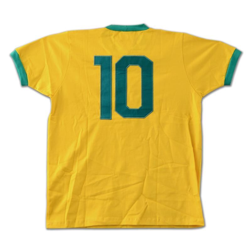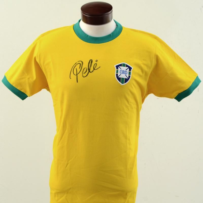 This is a replica Brazil soccer Jersey autographed by legendary Brazilian footballer, Pele! This piece is presented with a Letter of Authenticity from PSA/DNA, which authenticates sports memorabilia using proprietary permanent invisible ink as well as a strand of synthetic DNA. We make no additional warranties. Measures approx. 30" x 28" (jersey).