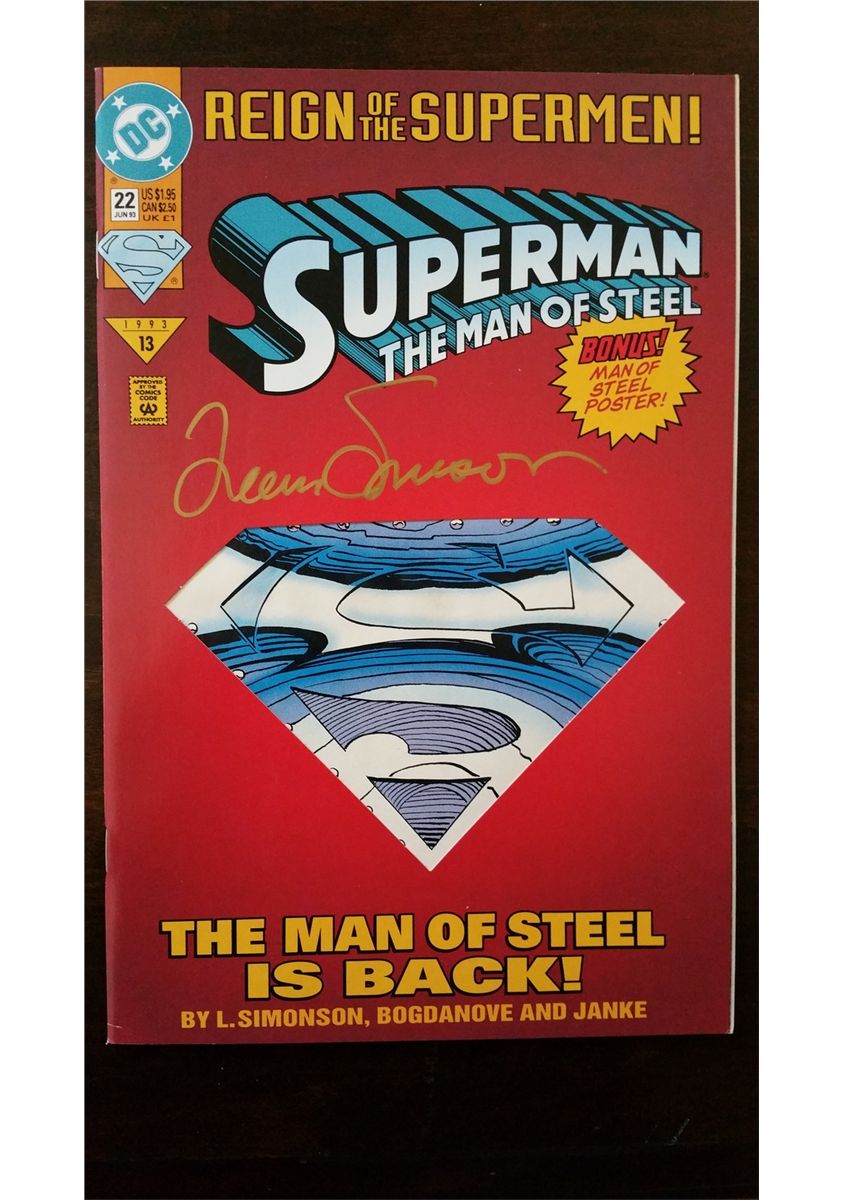 This Superman: The Man of Steel issue #22 was published in June 1993, and is signed in Gold Sharpee on the front cover "Team Simonson" by writer Louise Simonson.