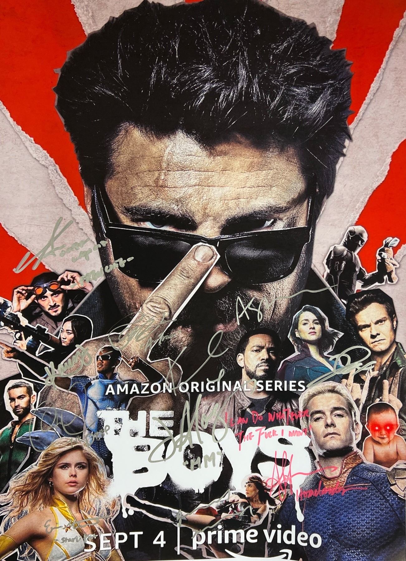 Autographed: Anthony Starr, Chace Crawford, Dominique McElligott, Tomer Kapon, Jessie Usher, Erin Moriarty, Karen Fukugara, Jack Quaid, Karl Urban, Aya Cash, Laz Alonso