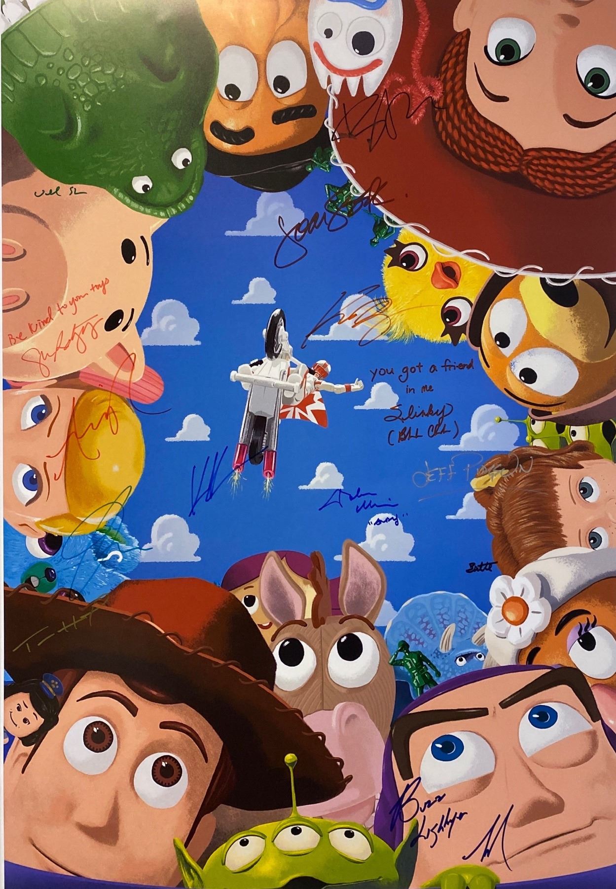 Autographed By: Tom Hanks, Tim Allen, Joan Cusack, Wallace Shawn, John Morris, John Ratzenberger, Blake Clark, Jeff Garlin, Keanu Reeves, Jordan Peele, Keegan-Michael Key, Tony Hale, Annie Potts, Estelle Harris