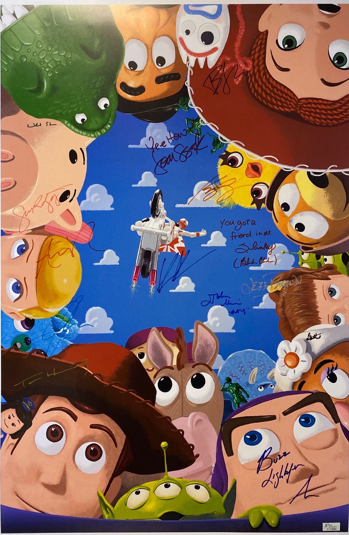 Autographed By: Tom Hanks, Tim Allen, Joan Cusack, Wallace Shawn, John Morris, John Ratzenberger, Blake Clark, Jeff Garlin, Keanu Reeves, Jordan Peele, Keegan-Michael Key, Tony Hale, Annie Potts, Estelle Harris
