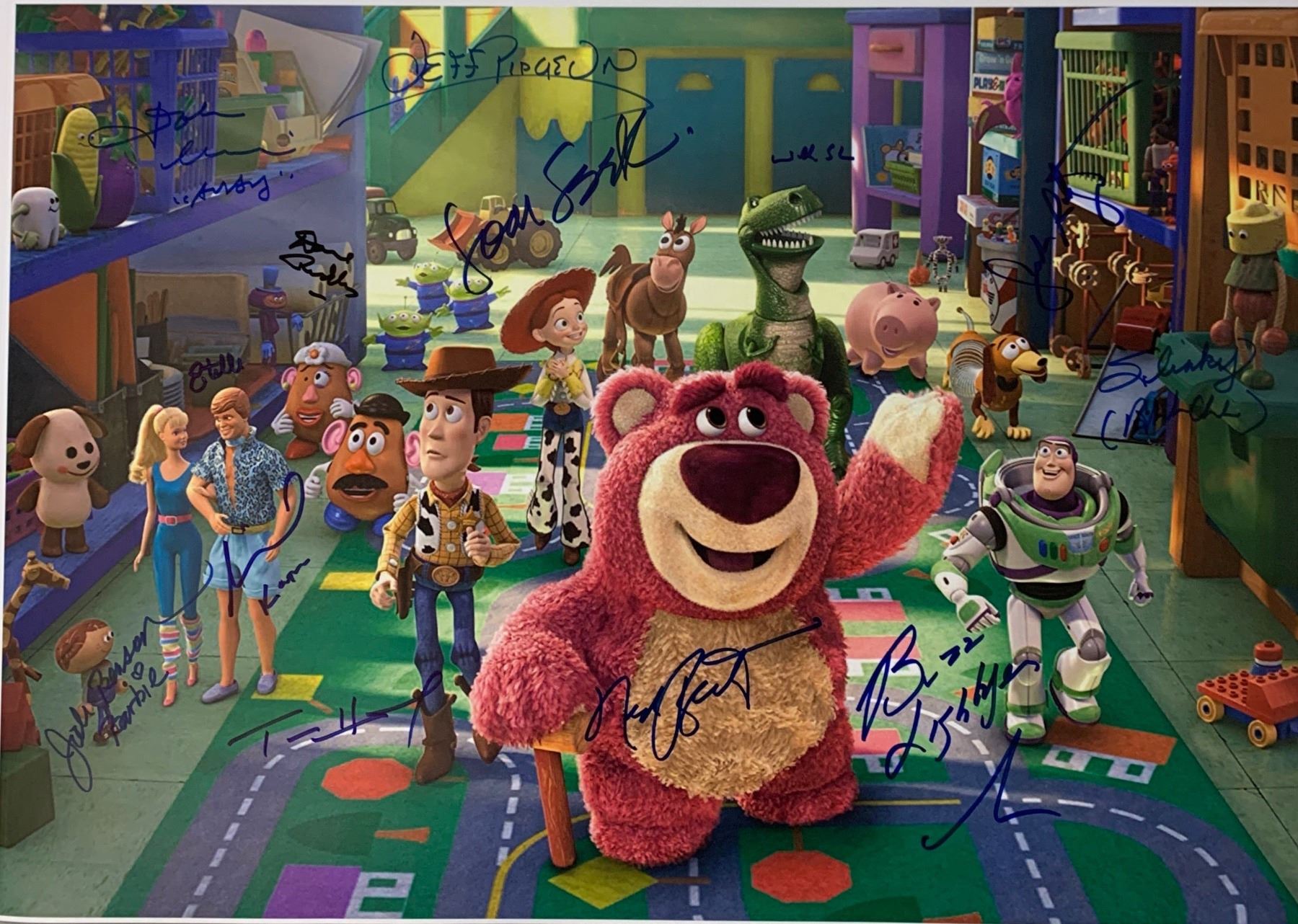 Autographed By: Tom Hanks, Tim Allen, Joan Cusack, Ned Beatty, Don Rickles, Michael Keaton, Wallace Shawn, John Ratzenberger, Estelle Harris, Jodi Benson, Blake Clark, Jeff Pidgeon, John Morris