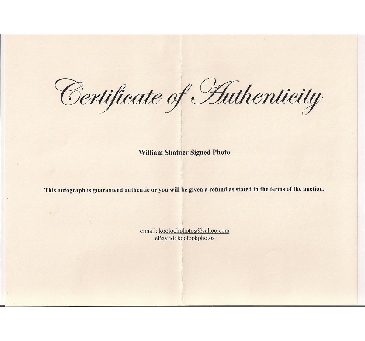 Autographed William Shatner 8x10 Color Photo. This photo is signed in Silver Ink, and comes with a Certificate of Authenticity. The Autograph and Photo are in Near Mint condition.