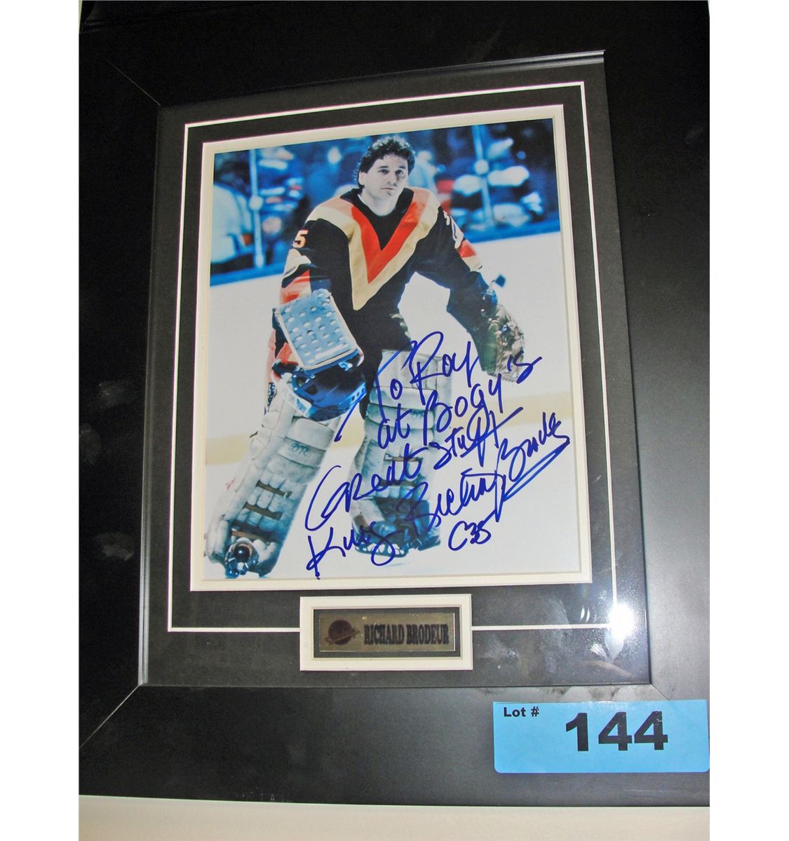 Richard Brodeur 8x10 photo in 15x18 frame. Note: Personalized "to Roy at Bogy's great staff"
