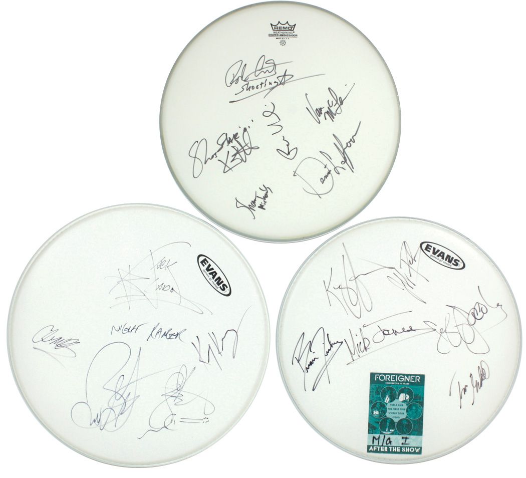 Autographed drum heads (3), Foreigner, Night Ranger & Shooting Star, signed by Mick Jones, Jack Blades, Van McLain & others, signatures obtained in person by Steve Pilchen, Exc cond, 14.5"Dia.