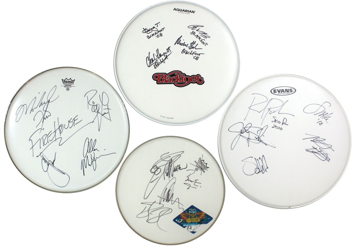 Autographed drum heads (4), Cheap Trick, Firehouse, Blackfoot & Skid Row, signed by Robin Zander, CJ Snare, Greg T Walker & others, signatures obtained in person by Steve Pilchen, Exc cond, up to 15.5"Dia.