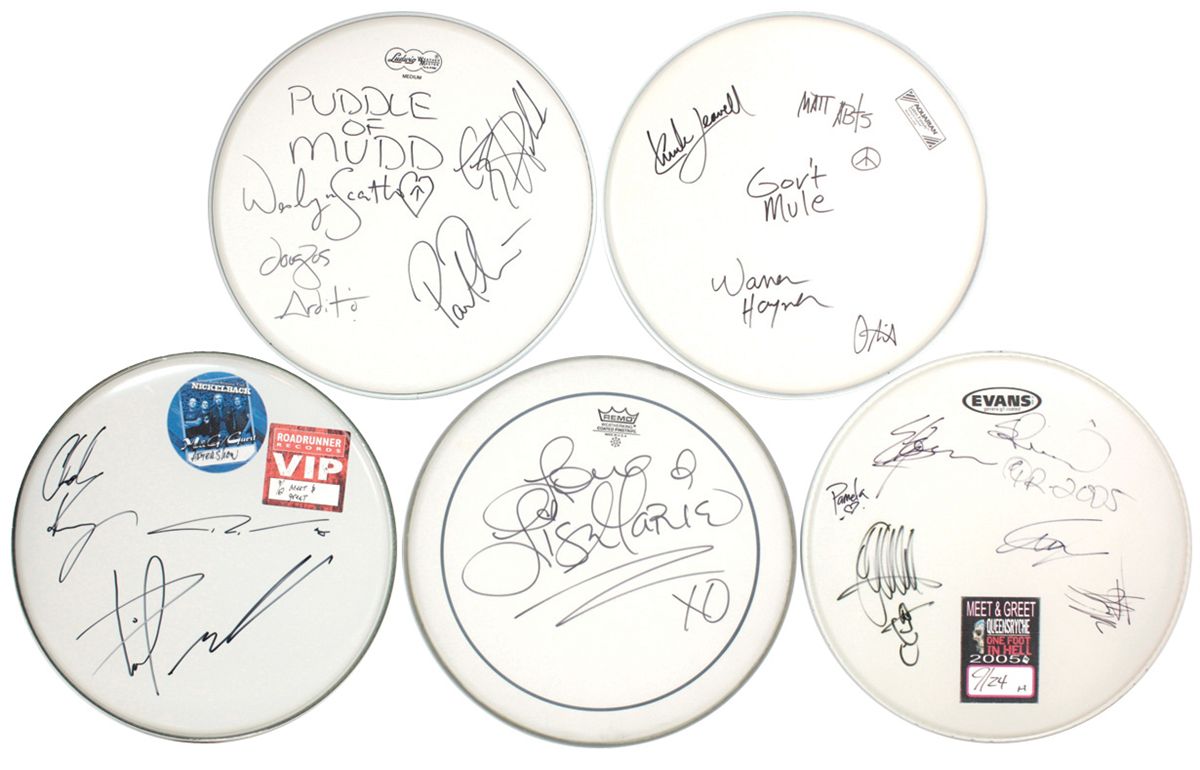 Autographed drum heads (5), Queensryche, Government Mule, Lisa Marie Presley, Nickelback & Puddle of Mudd, signatures obtained in person by Steve Pilchen, Exc cond, 14.5"Dia.