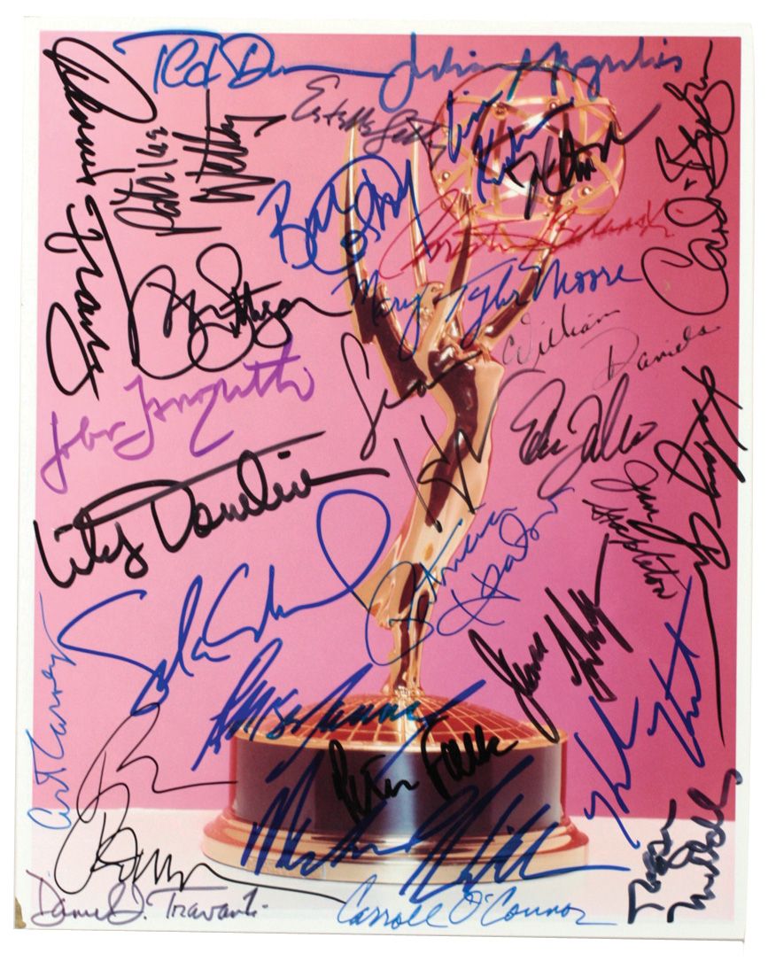 Autographed photo, Emmy Award signed by 30+ winners of Best Actor/Actress in a series including Candice Bergen, Carroll O'Connor, Bill Cosby, Ted Danson, Lily Tomlin, John Lithgow & others, Exc cond, 10"H x 8"W.