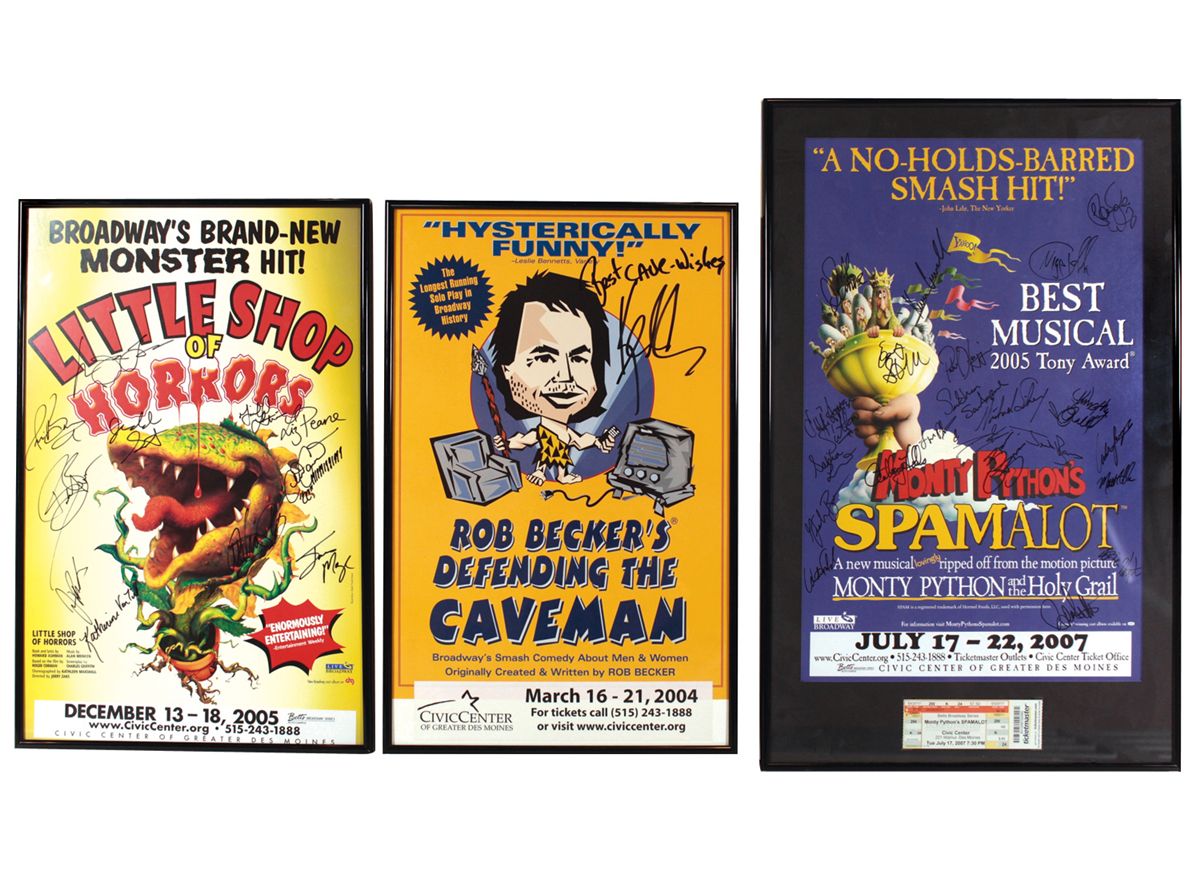 Autographed theater posters (3), Little Shop of Horrors (12/13/05), Rob Becker’s Defending the Caveman (3/16/04) & Monty Python’s Spamalot (7/17/07), signed by cast members from Des Moines, IA productions, Steve Pilchen collection, Exc cond, up to 26.5"H x 17"W.