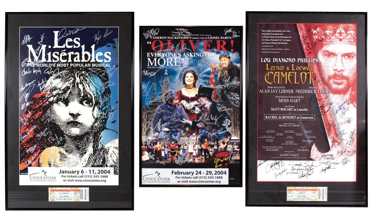 Autographed theater posters (3), Oliver (2/24/04), Lerner & Loewe’s Camelot (10-23-07) & Les Miserables (1/6/04), signed by cast members from Des Moines, IA productions, Steve Pilchen collection, Exc cond, up to 27.5"H x 18"W.