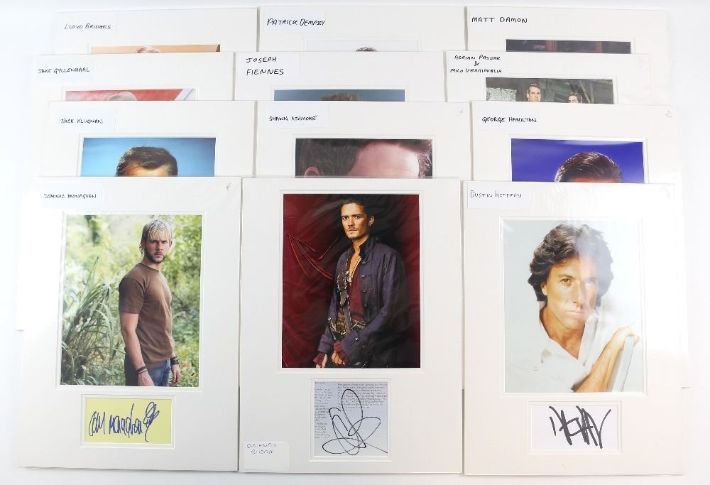 Autographs - 12 mounted autographs of Dominic Monaghan, Jack Klugman, Shawn Ashmore, Orlando Bloom, Dustin Hoffman, George Hamilton, Jake Gyllenhaal, Joseph Fiennes, Adrian Pasdar, Milo Ventimiglia, Matt Damon, Patrick Dempsey & Lloyd Bridges, all 12 x 16 inches. Provenance: All collected in person by the vendor. Most have details of where and when obtained on the reverse.