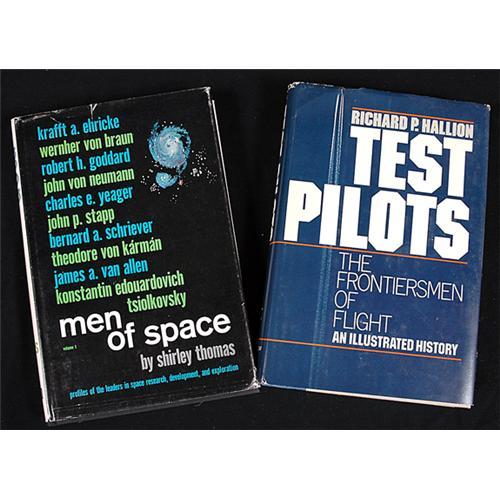 <Our item number 138327><B>Autographs, Lot of Two Books Autographed by the Authors.</B> Included are "Men of Space" (volume 1) by Shirley Thomas (1960, First Edition, Second Printing, November 1966, 235pp., hard with dust jacket). This book, with a 1990 inscription: "To Deke, You are an outstanding man. I'm glad I knew you! Kind wishes, Shirley", includes profiles of the leaders in space and contains profiles of von Braun, Yeager, von Karman, van Allen, Tsiolkovsky, etc. ALSO, "Test Pilots, The Frontiersmen of Flight, an Illustrated History" by Richard P. Hallion (1981, First Edition, 347pp., hard with dust jacket). The title page is inscribed: "To Deke Slayton - one of the real history-makers - with respect and admiration, Richard P. Hallion, September 1982". Minor staining on the page edges. An interesting pair. <BR>Estimated Value $250 - 350. <I><BR>Ex. the Donald "Deke" Slayton Estate collection.</I> <BR><BR>Our item number 138327<BR> <IMAGES><P ALIGN="CENTER"><IMG SRC="http://www.goldbergcoins.net/liveauction/49jpegs/138327.jpg"> </P></IMAGES>