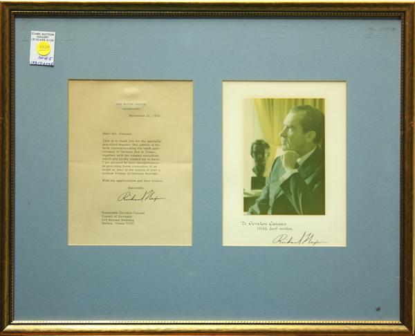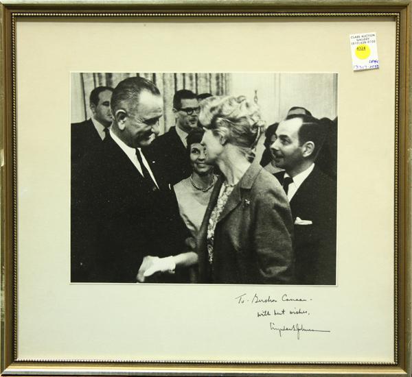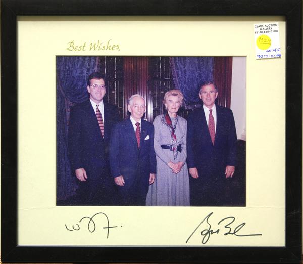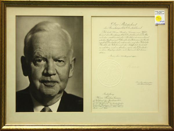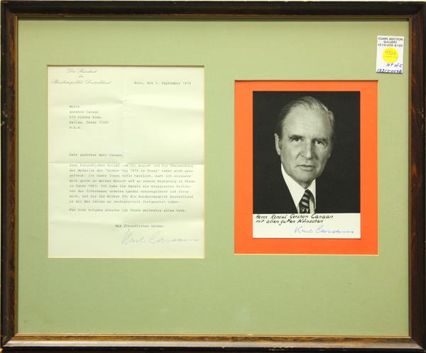 (Lot of 5) Framed autographed photographs and documents, including signatures (auto-pen or possibly by a secretary) by former United States Presidents George W. Bush, Lyndon B. Johnson, Richard Nixon, former German Consul Gershon Canaan and former German President Karl Carsten, largest overall: 18.75''h x 22''w