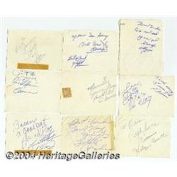 <B>Autographs by Chuck Berry, Little Richard, Bill Haley and many more.</B></I> These autographs were collected at a 1956 show at the Maple Leaf Gardens in Toronto (a newspaper advertisement for the show is included with this lot). All artists signed in pencil on small 3 1/4 by 4 inch slips of paper. In addition to Haley, Comets members Franny Beecher, Ralph Jones and Johnny Grande signed. The Platters were also on the bill, and Zola Taylor, Dave Lynch, Herb Reed, and Tony Williams of that group are represented here. Frankie Lymon's autograph is in this group, as well as those of Buddy Bailey and Harold Lucas of the Clovers, plus Ella Johnson's autograph and those of Shirley and Lee. Berry (who had sixth billing for the event!) and Little Richard signed both sides of the same card. The other ten autographs haven't been conclusively attributed, but we do know that Clyde McPhatter, Buddy Johnson and his Big Band, the Flairs, and Shirley Gunther were also on the bill. <I>Accompanied by COA from PSA/DNA. </B></I> <BR><BR><B>Important notice:</B> Heritage usually auctions material at the rate of 200-250 lots per hour. On some occasions eBay Live bid software or the Internet may not be able to keep up with the pace of the auction. We recommend placing a realistic absentee bid now as insurance to avoid disappointment. Occasionally the auctioneer may eliminate or reject an eBay Live bid, and the auctioneer may also reopen a lot after the close of the eBay live bidding (usually because we missed an audience bid), and may reject your bid even if it shows you as the winning bidder. By bidding via eBay Live, you agree that Heritage may award the lot to another bidder at its sole discretion under the circumstances described above or any other reasonable circumstances. Since eBay bids are not shown to us until we open the lot on the floor, we treat those bids just like floor bids. In most cases the floor responds before the eBay bid is presented to us, due to Internet lag time, so for consistency we have made it a policy that floor bids are always considered first over tie eBay live bids. Also please note that all Heritage lots purchased through eBay Live carry a 24.5% Buyer's Premium. Please make sure you read the Terms and Conditions before you bid.