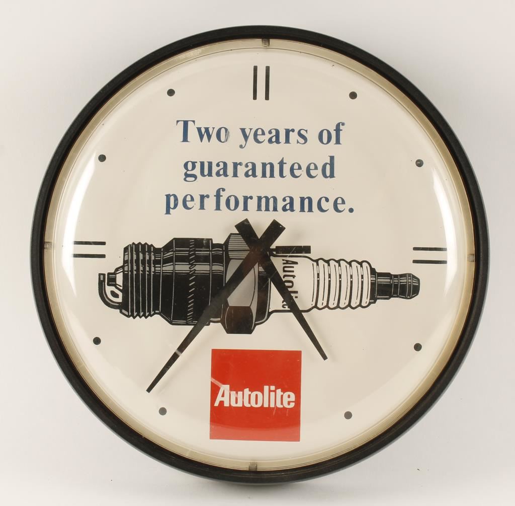 Round Autolite Sparkplug battery powered clock-working. "Two Years of Guaranteed Performance, Autolite". 14" across. Overall condition very good.