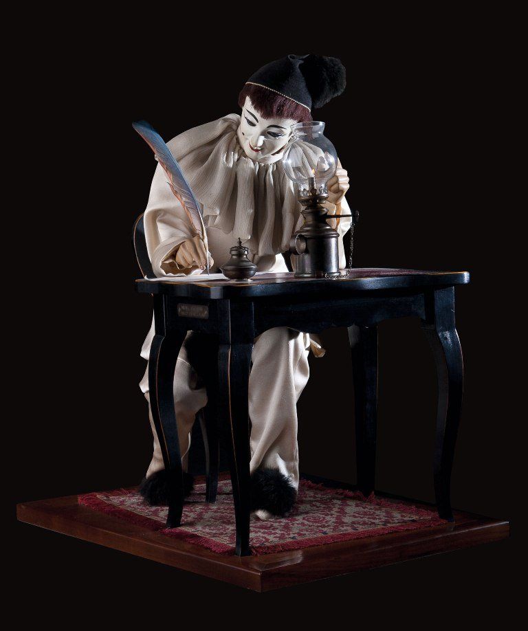 Automat «Pierrot Ecrivain». One of the most popular and desirable automaton by Gustav Vichy and reproduced with original parts by Michel Bertrand- the last successor of Vichy/JAF. The Pierrot sits at his table and writes a loveletter. The little lamp gets darker and he falls asleep. He suddenly wakes up, turns the light up and finishes his letter. All the mechanics and music is hidden in his body. Museum's quality. 55,5 x 37 x 59cm. Gustav Vichy / M. Bertrand, St. Croix, Switzerland, circa 1880/1990.
