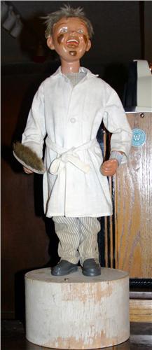 Laughing figure of man holding a paint brush stands approximately 25" tall. Add another 6" for the round base. Electric movement causes figure to raise and lower hand holding brush. Probably used to advertise paint.