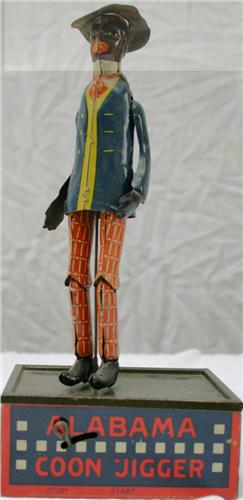Tin black toy, Automated Tombo Alabama Coon Jigger, lithographed tin dancing man. Key wind. Ferdinand Strauss Co., New York.. Patented 1910. Nice condition. 10"