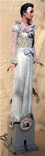Attractive lady model in lace dress stands on box with Fruit of the Loom decals on all four sides. Lady is approximately 39" tall. Box adds another 10" to overall height. Lady revolves on turntable. Electric. Excellent condition.