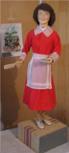 Automated lady with comb and mirror. Makes motion as if to comb hair and lifts mirror for a look and returns to original position. Electric.