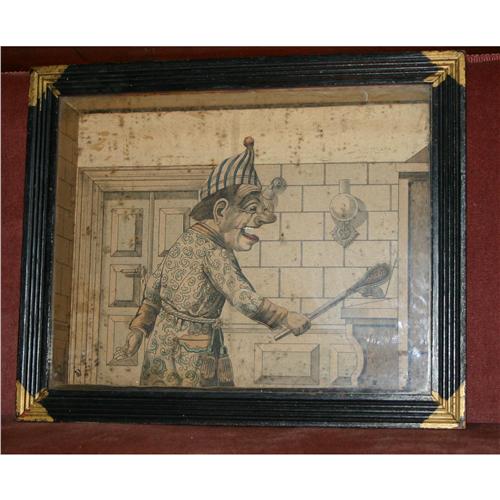 Framed Automated Tableau depicting man in night shirt attempting to catch a mouse. Works on clock spring mechanism. Key wind works, but needs work to make fully operational. Measures 14" x 11" x 5 ½" D. Wear to the case. Interior needs cleaning.