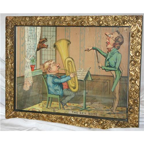 Automated Tableau entitled The Key Note portrays the maestro directing student as he plays his instrument. Operates on clockwork spring which is intact. However, adjustments will be required to make it fully operational. Movements include donkey from behind curtain, and movements of head and arm of both student and maestro. Measures 14" x 11" x 4.5" deep. Graphics clean and bright. Replacement back door.