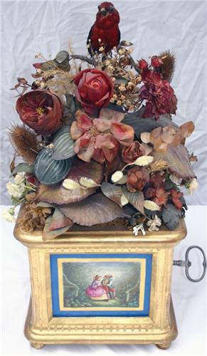 Automated whistling bird in nest of roses and foliage. Gold music box base with Victorian couple pictured on front. Bird has glass eyes, moves head and tail feathers as it whistles a tune. Original key. Measures approximately 20" x 8".