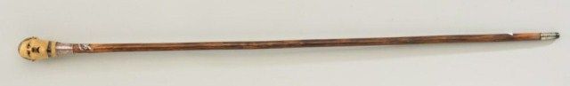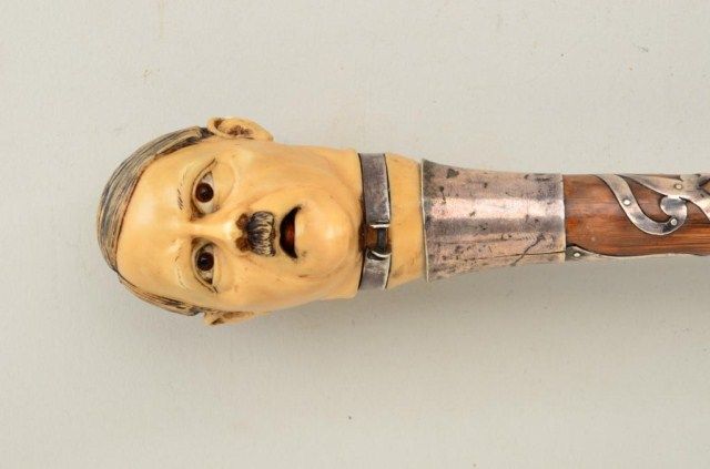 Automated cane with figure of Adolf Hitler mounted on top of grip decorated in silver on select hardwood shaft with silver tip. The cane measures 37-1/2" in length the figural portion measures 2-1/2" by approx 2-3/4".The head of Hitler is well detailed and a button at the back of his head causes his eyes to roll and his tongue to stick out like he is being chocked by the silver band or collar around his neck. An amusing odditycane sure to date from the battle of Britain era. Est.; $1,000-$3,000.