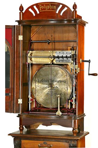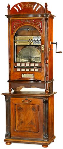 Wechselautomat "Polyphon Nr. 4", um 1900 Seltener Wechselautomat für 10 Platten mit 50 cm Durchmesser, 118 Zähne-Doppelkamm (komplett!). Plattenauswahl mit Außenhebel, Münzbetrieb (Einwurf 5 Pf.), Standmodell mit Platten-Unterschrank. Maße: 84 x 49 x 235 cm. - Mit 10 Platten! - Literatur: D. Bowers, "Encyclopedia", 1977, S. 155. - Restaurierter und exzellent spielender Zustand! - Extrem seltene Größe (50-cm-Platten)! - Seinerzeit wie heute eine absolute technische Sensation! - Eins der ganz großen Sammlungsstücke mit hervorragendem volltonigen Klang! Ein ganz besonders spektakuläres Exponat von hoher Museumsqualität.