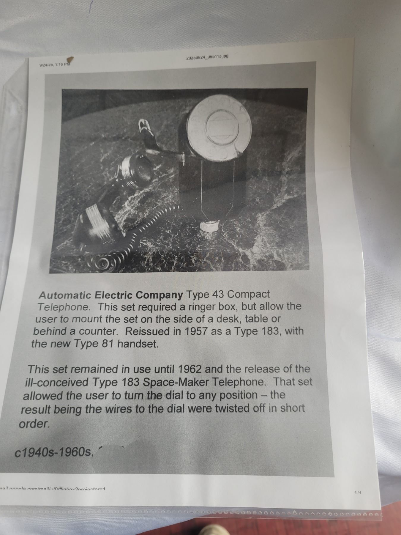 Type 42 compact telephone. C1940s-1960. Pickup at 9 am