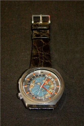 Montre-bracelet boîte acier monobloc, automatique, signée EDOX GEOSCOPE, très beau cadran avec la mappemonde, couronne à 2 heures sert à tourner une lunette tournante pour lire les heures du monde, années 1970