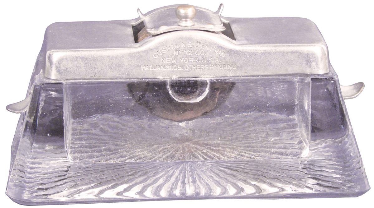 Automatic stamp moistener by Cushman & Denison Mfg. Co. NY, patented 1905. Pressed glass and nickel. Excellent condition. 4 1/4 X 2 1/2 inches. Start Price $40