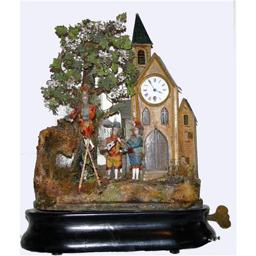 Tight Rope Walker Automaton. An automation depicting a daring act of balancing on a wire stretched high above the ground. A figure walks across the wire with a balancing pole in hand. A band of musicians are below playing as the action unfolds. Nice and colorful piece in good condition. We have no dome, but they are not difficult to obtain. Plays two airs.