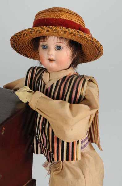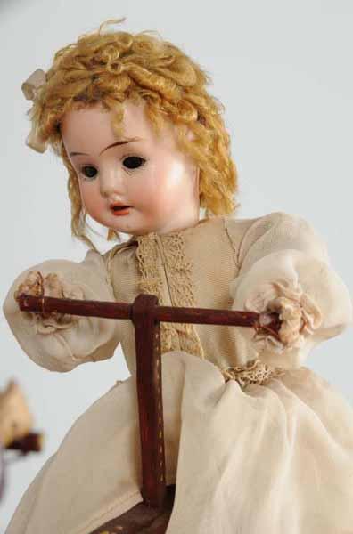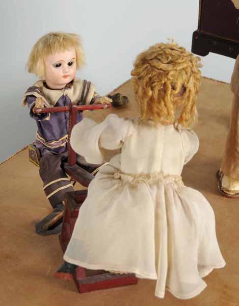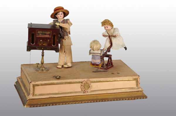 Description Possibly French. All original. Figures includes one organ grinder and two children on sea-saw with bisque bodies. Organ grinder plays music as hand rotates crank. Children move up and down on sea-saw. Clothes are replaced on all figures. Condition (Excellent). Size 20" T.